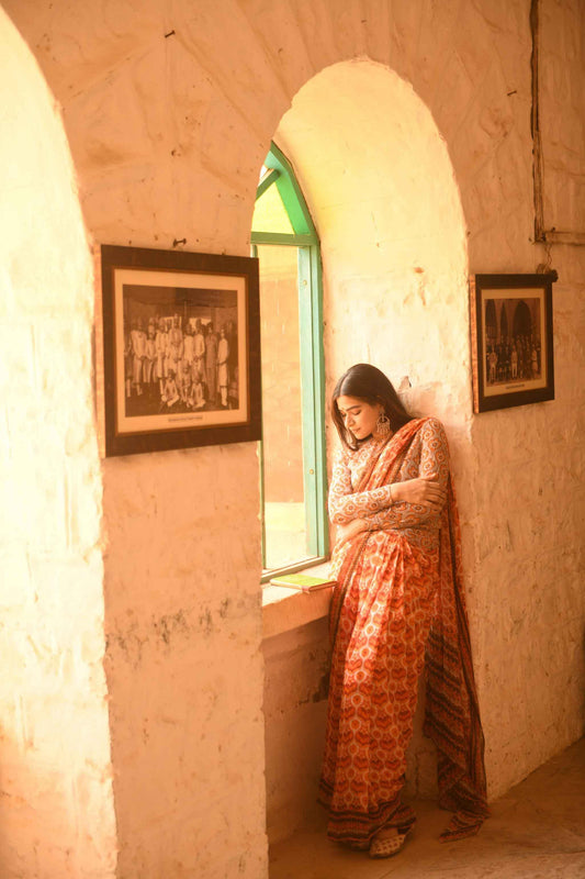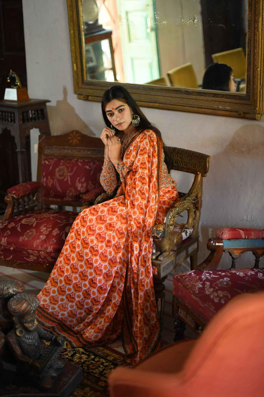 A printed modal viscose silk saree with a retro print. The saree comes with a contrasting blouse piece as shown.