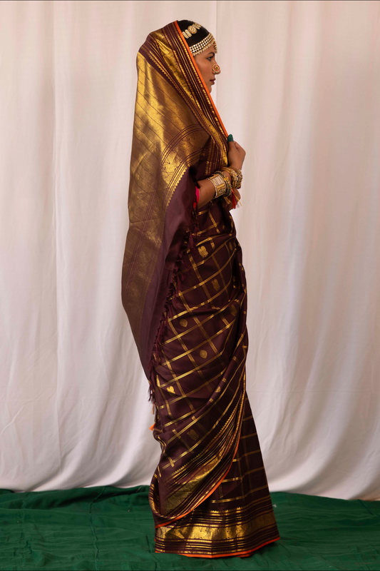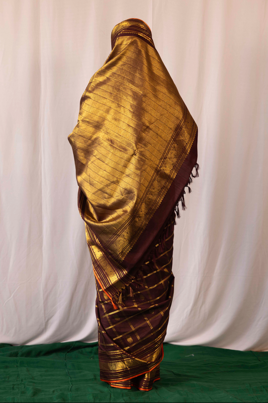 A beautiful handwoven mauve and antique gold Kanjivaram silk saree. It comes with a matching blouse as shown.