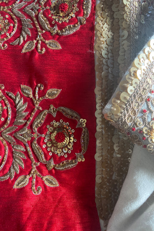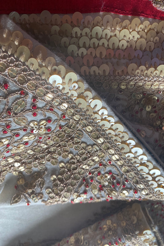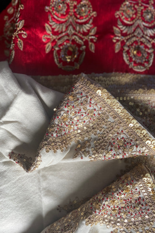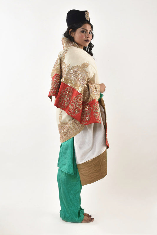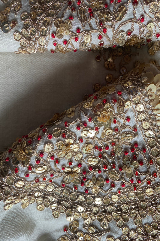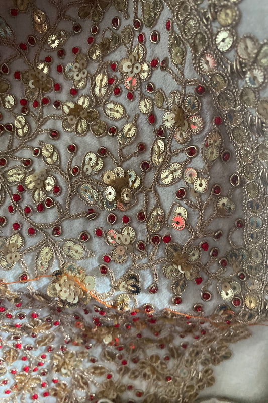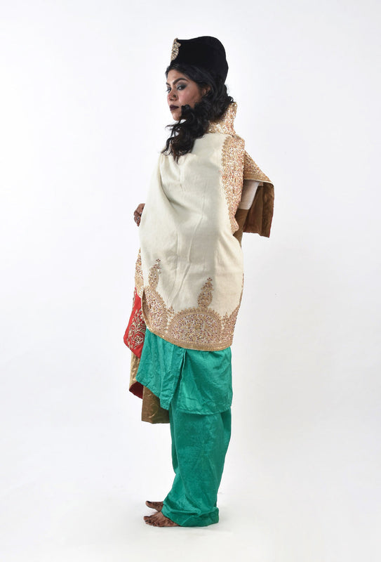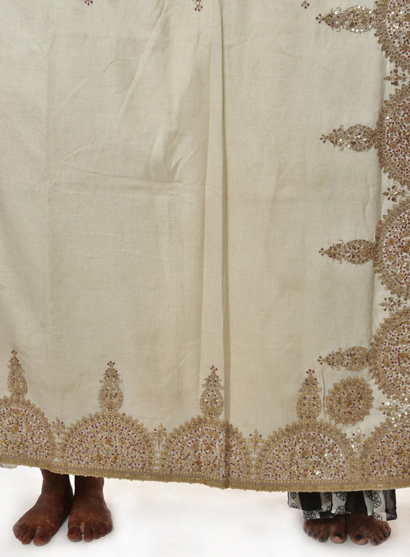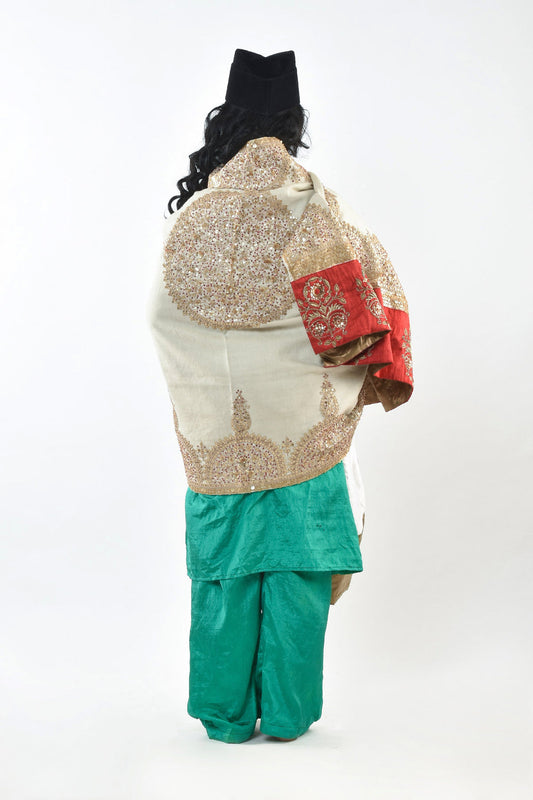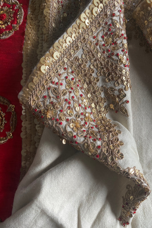 Care for this beautiful piece by storing it in muslin cloth and keep it away from direct sunlight. Open the piece and air it every few months. Dry Clean only.