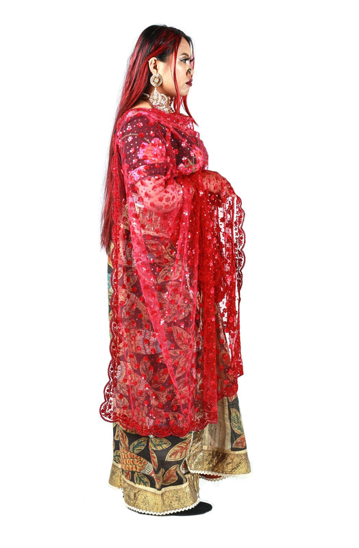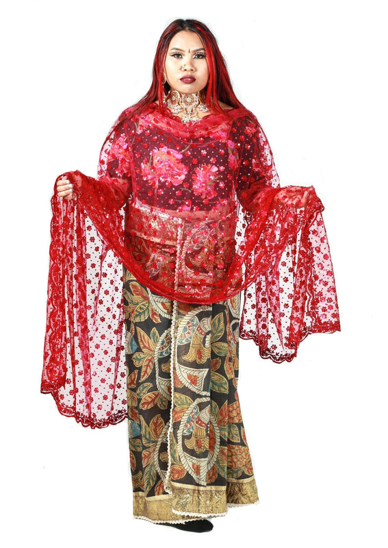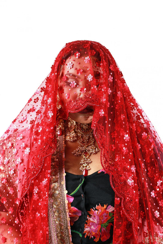 A hand embroidered wedding bridal net designer dupatta with a scalloped embroiderd border.