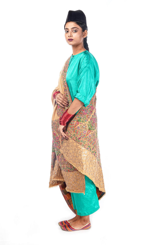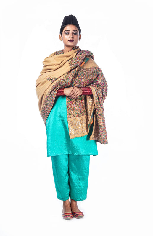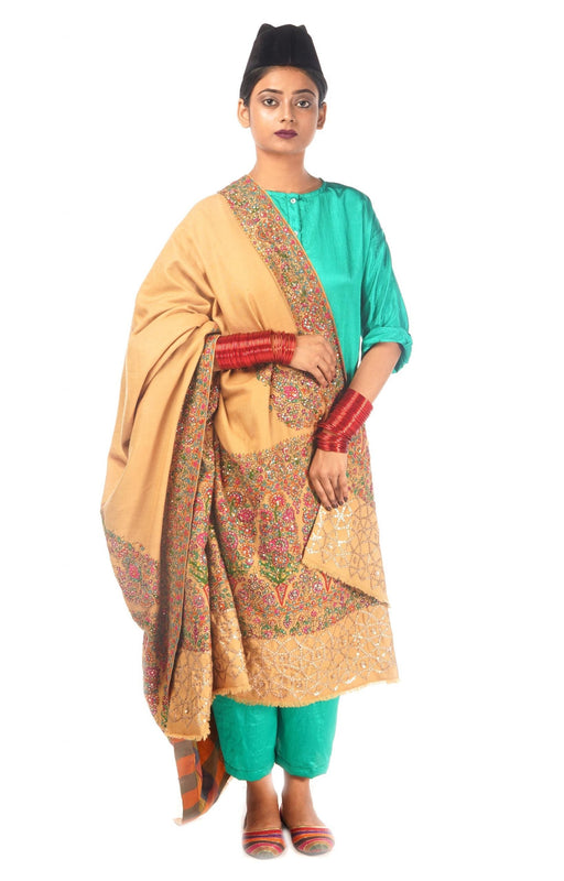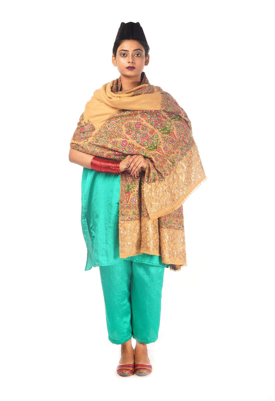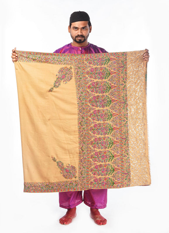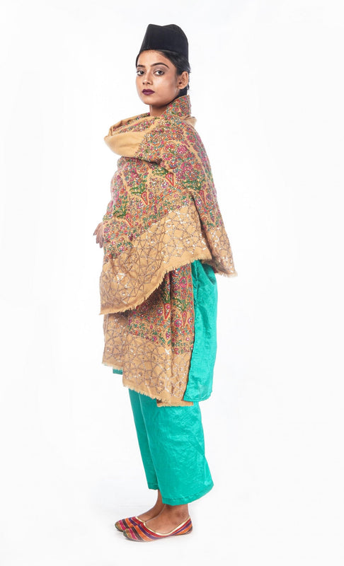 A handwoven Kashmiri pashmina Woolen Shawl with kashmiri hand embroidery and tilla work with an embroidered edging.