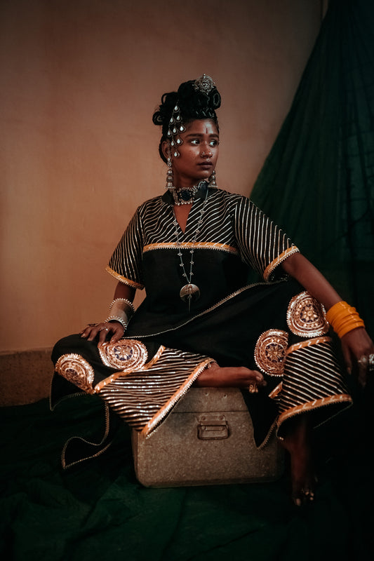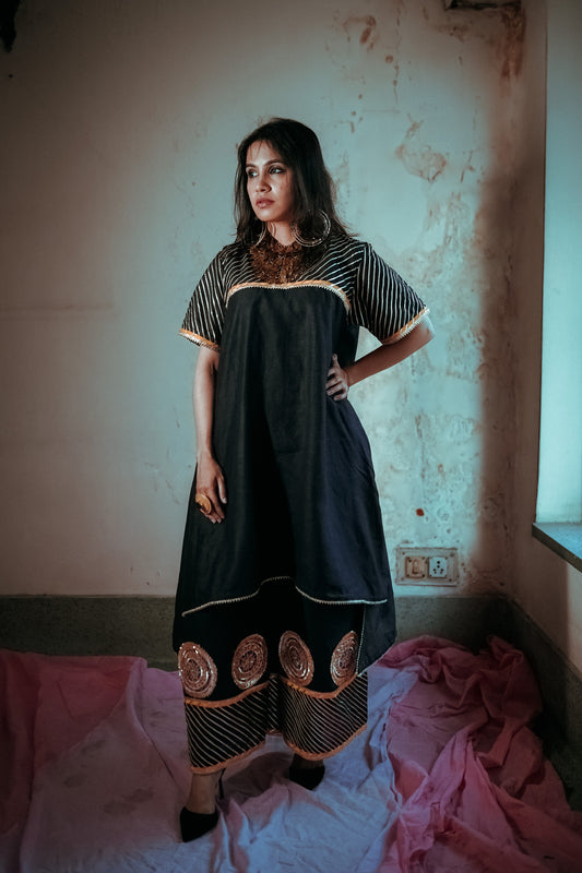 A black pant and kurta set made with Bhagalpuri cotton silk with bold gota Patti details. Free Size (This Size fits most).