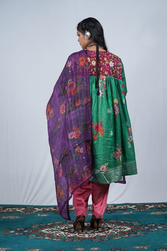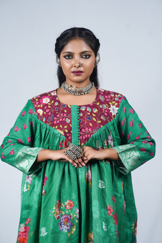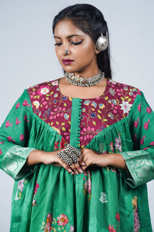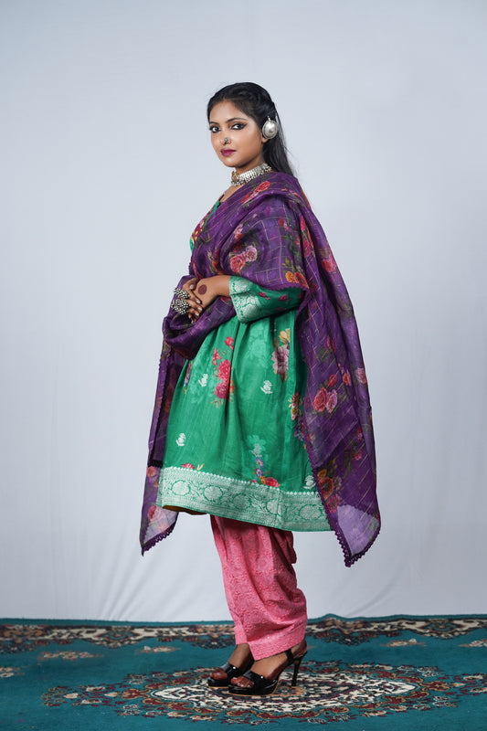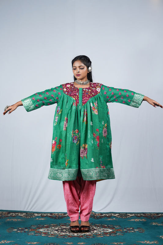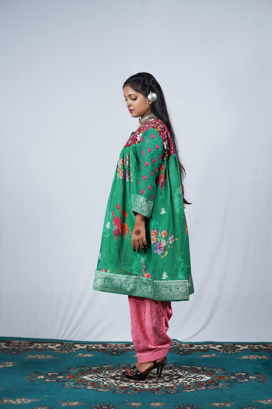 A banarsi hussar silk embroidered kurta with a chicken kari  salwar and a Chanderi silk dupatta (3 pcs). Free Size (This Size fits most).