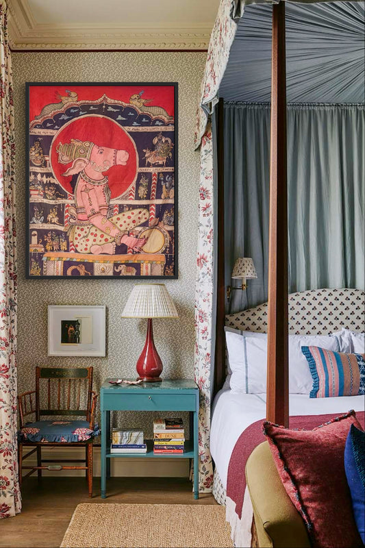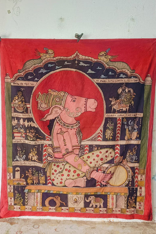 A beautiful hand painted real pen kalamkari wall painting depicting nandhieswara and the story of nandhi and shiva , made by skilled artists from India for The Ayush Kejriwal Art Project.