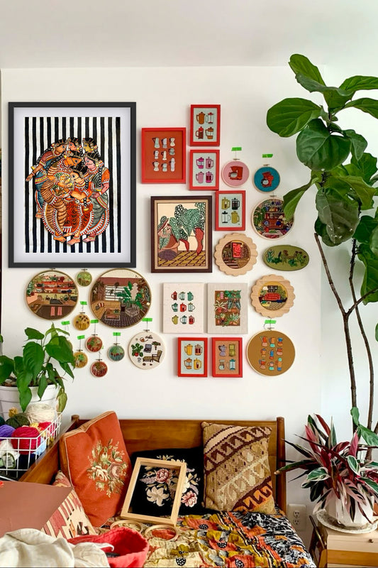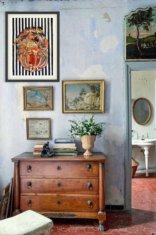 Here you see a beautiful handcrafted puppets stitched on a handpainhed background. Made by skilled master artists for The Ayush Kejriwal Art Project.