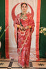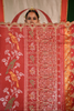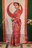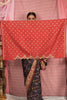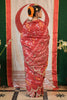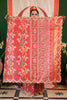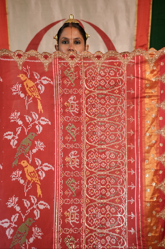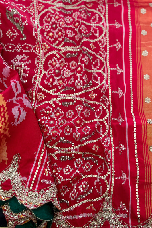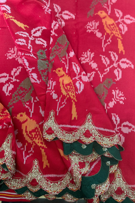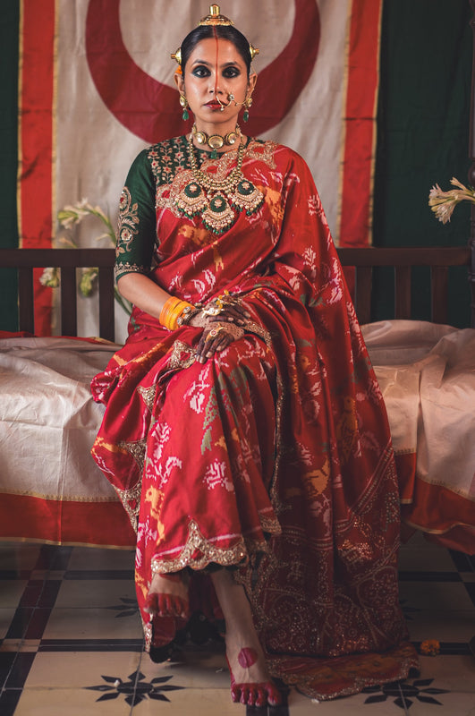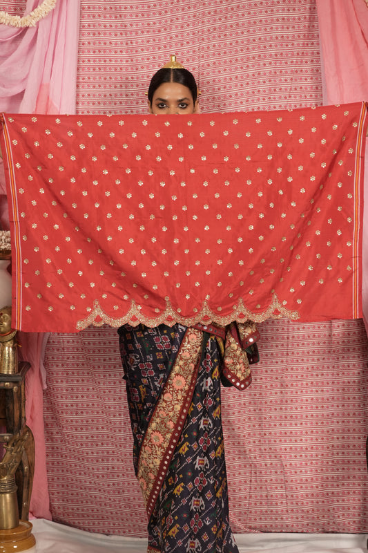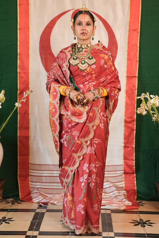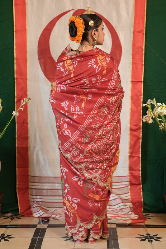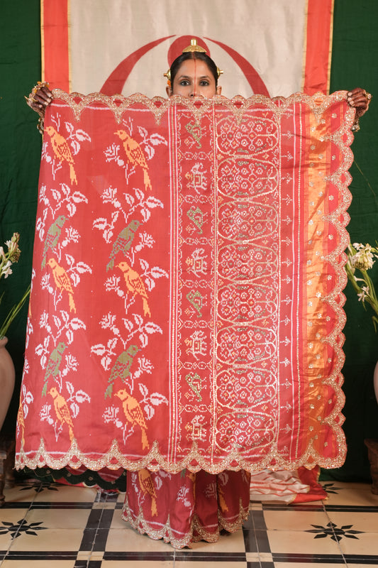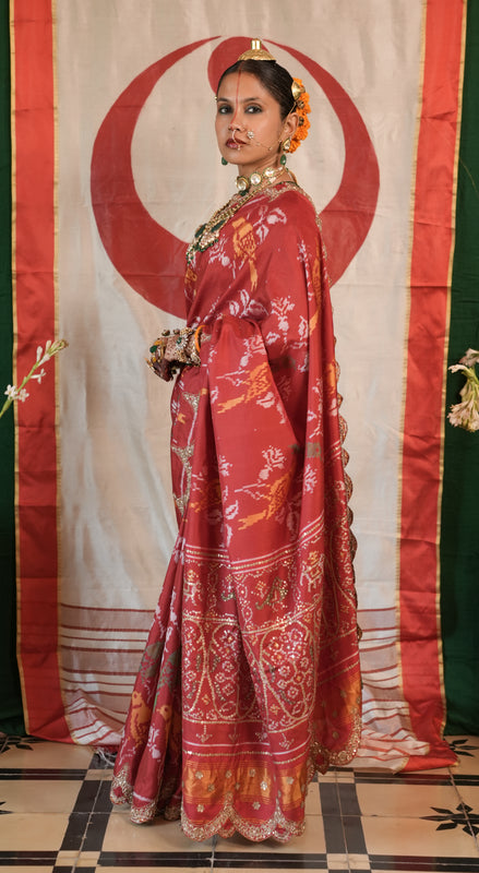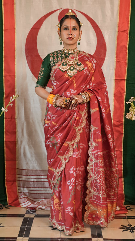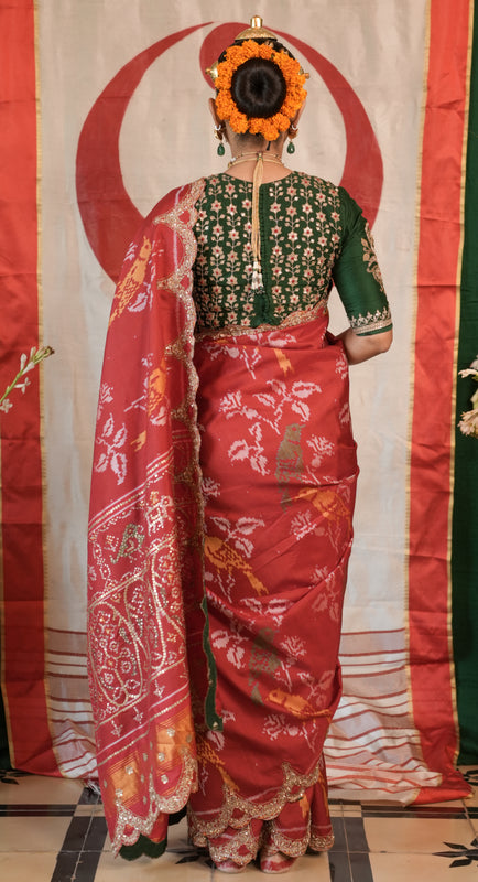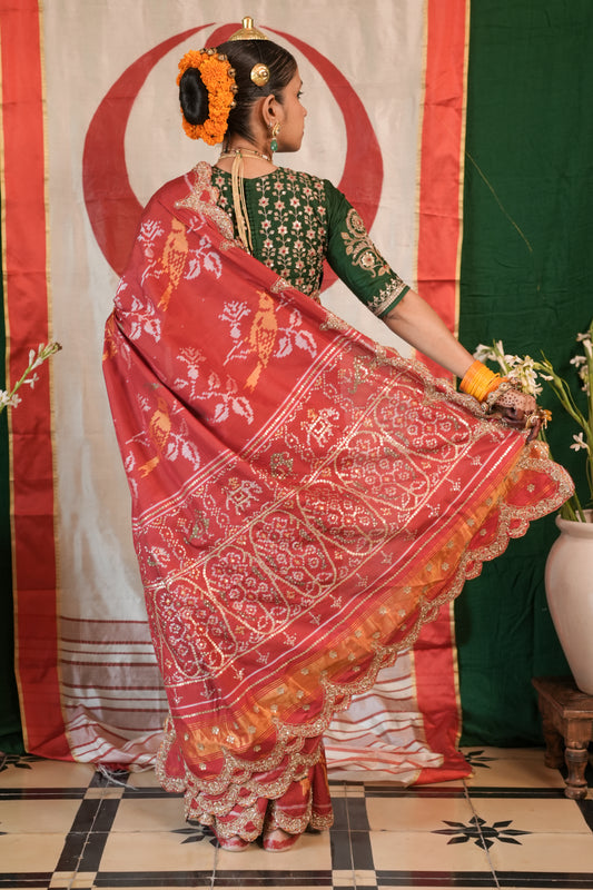 An unique, handwoven, single ikkat patola silk saree which has been hand embroidered with a beautiful scalloped border and pallu. It comes with an embroidered blouse piece as shown.