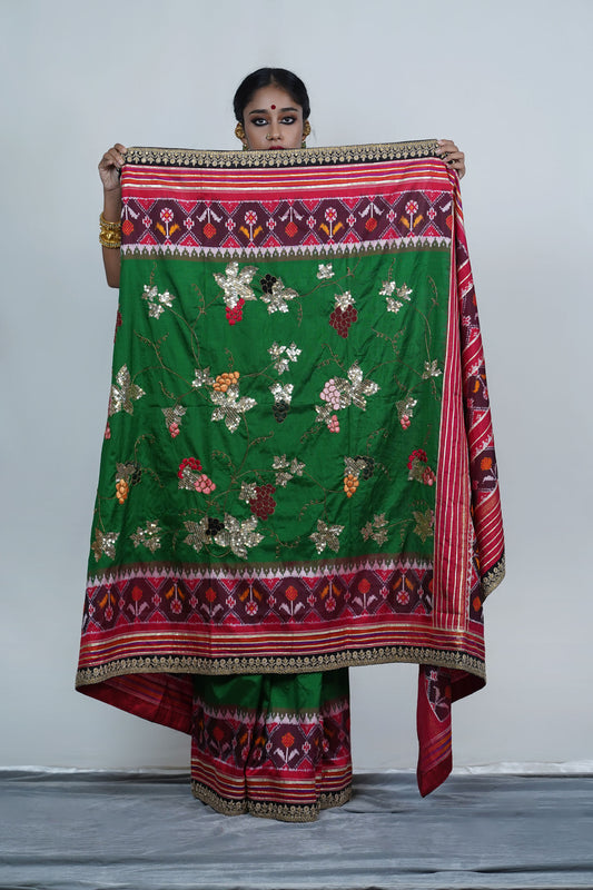 An unique, handwoven, single ikkat hyderabdi patola silk saree which has been hand embroidered. It comes with an red embroidered blouse piece as shown.