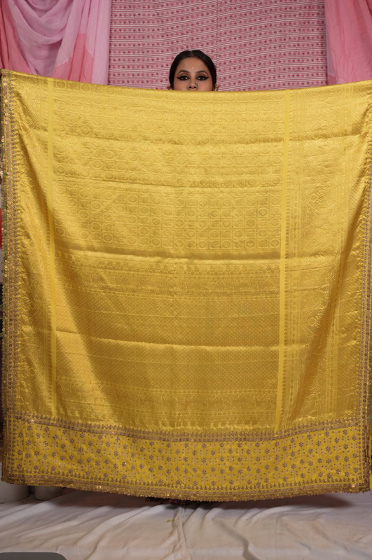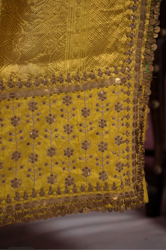 A handcrafted embroidered kanjiveram silk dupatta. The dupatta is finished with a back border to give it a lovely finished when you move around.