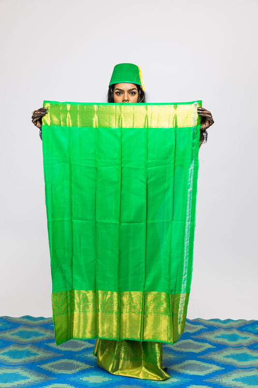 A hand woven lime green and silver gold Kanjiveram silk saree. It comes with a blouse piece (shown separately)