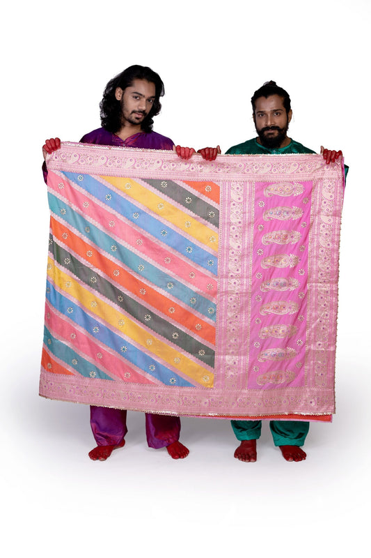 A handwoven Banarasi brocade silk rangketh saree that has been embroidered all over with gota and mirror work. It comes with an embroidered blouse piece (shown separately).