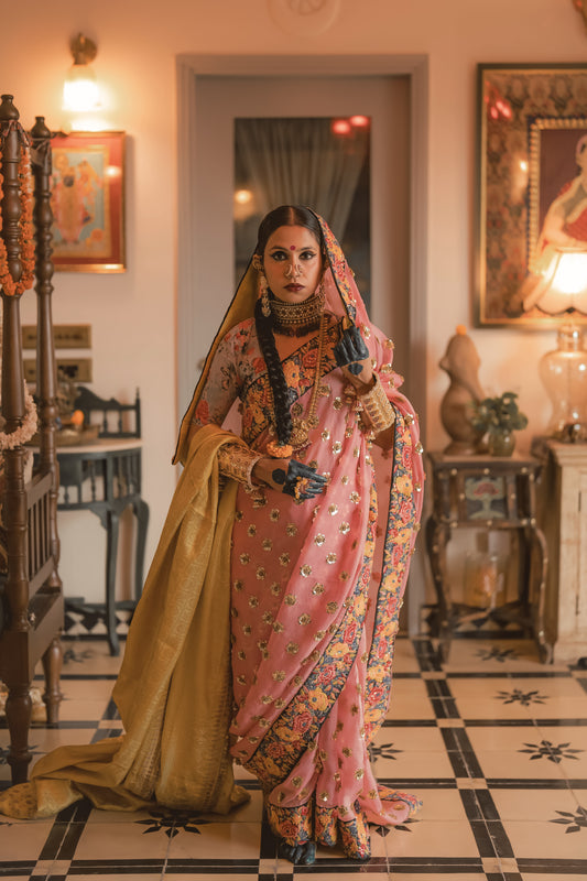A beautiful organza embroidered saree with an hand embroidered border. If you look closely you will see the whole saree has been embroidered with tiny gold flowers. The saree comes with a raw silk embroidered blouse piece as shown.