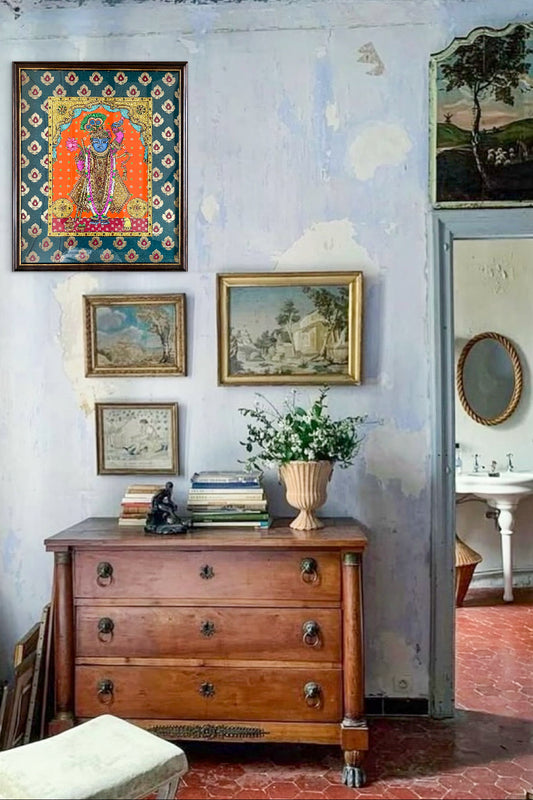 A beautiful handcrafted gold Tanjore painting of SrinathJi made by master artists for The Ayush Kejriwal Art Project. The picture comes framed with the beautiful green brocade mount as shown.