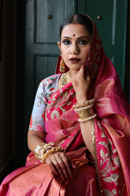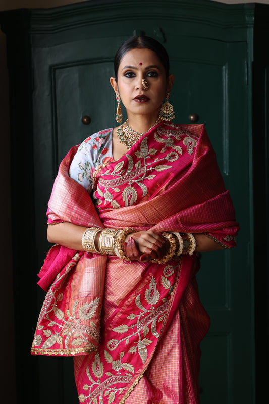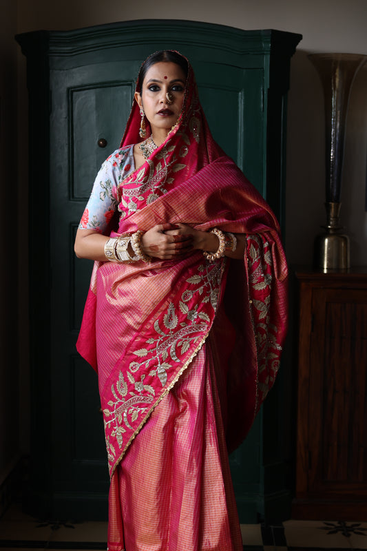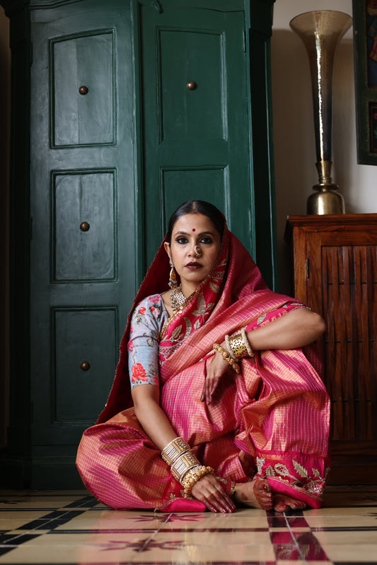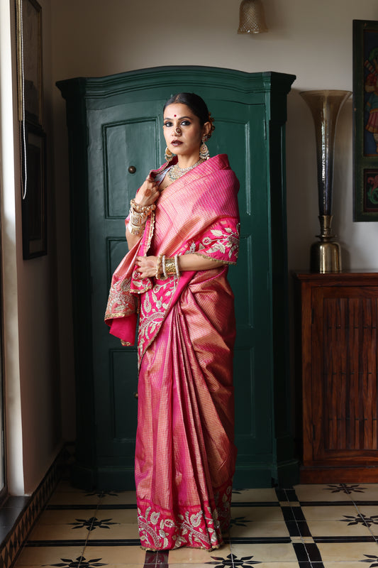 An unusual pink and gold handwoven, hand embroidered kanjiveram silk saree. The saree has been hand embroidered with hand using Ari Tari and zardozi work. The edge of the saree has been finished with silver sequins work.