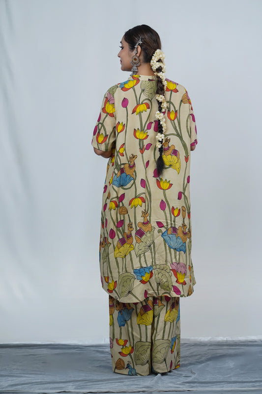 An authentic handpainted pen kalamkari Kurta and pant set (2 pcs). Free Size (This Size fits most).