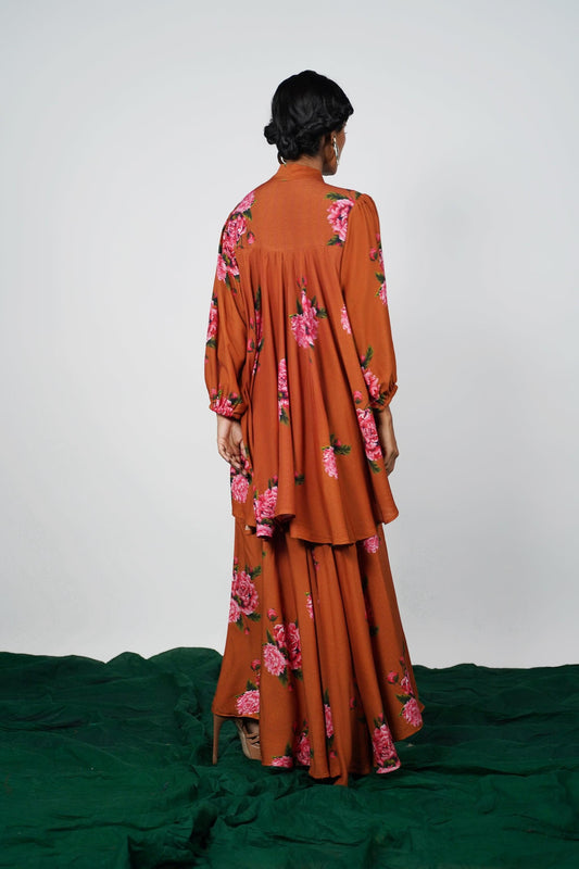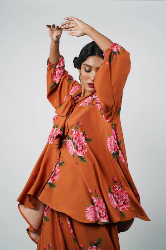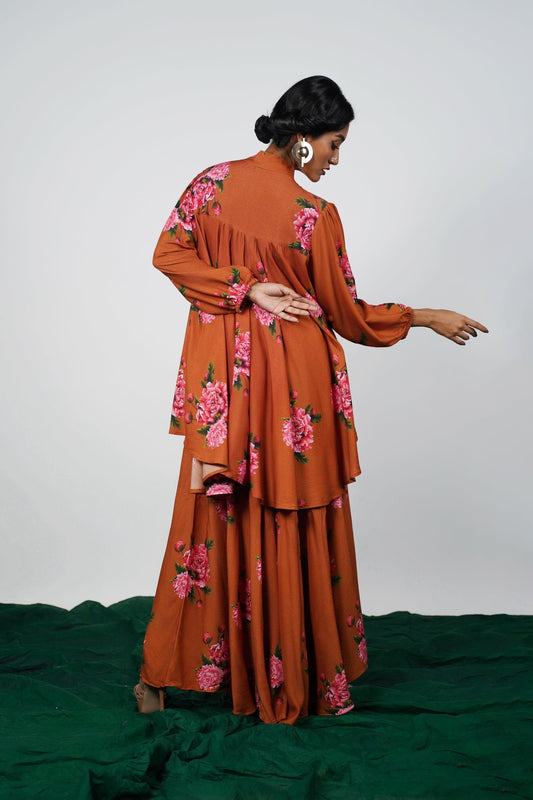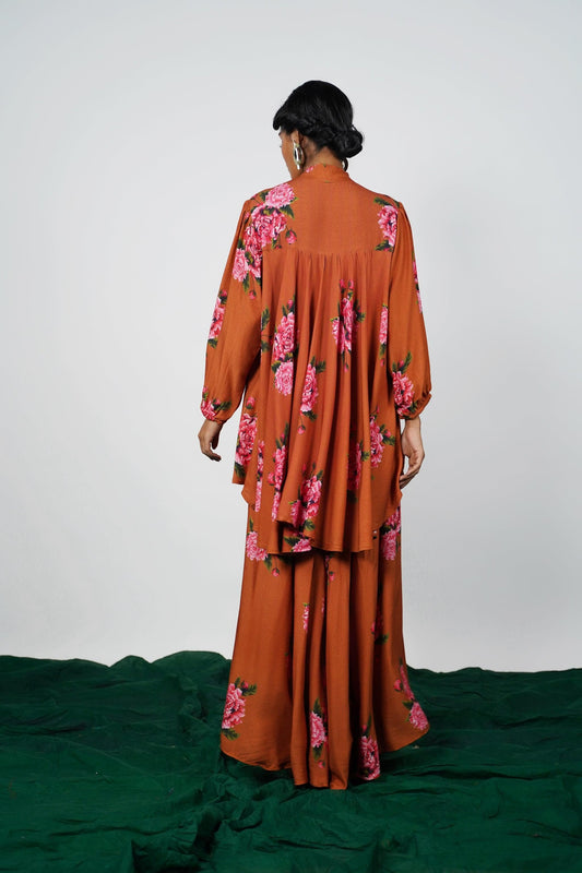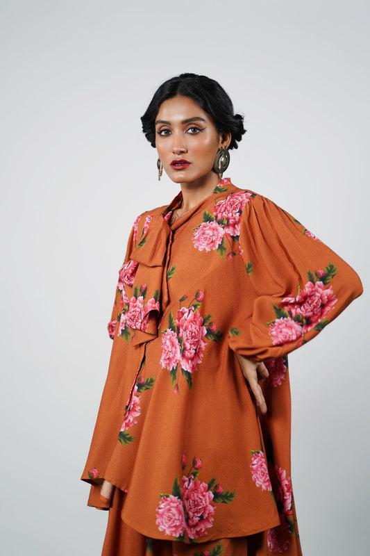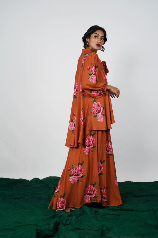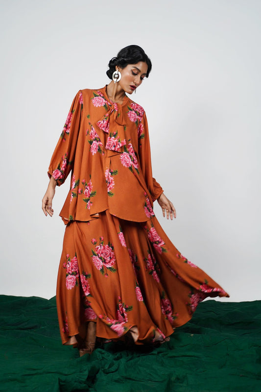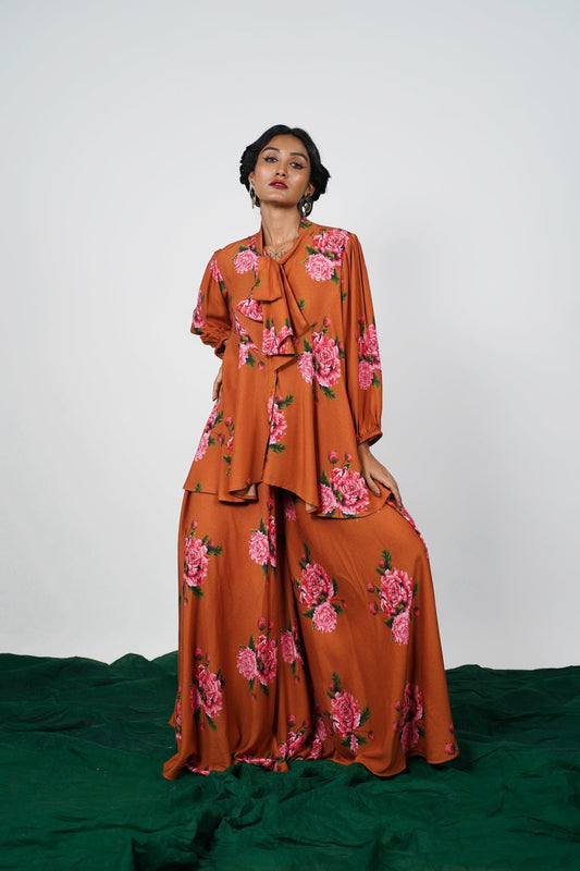 A printed rayon skirt pant and blouse set (2 pcs) with bold print details . Free Size (This Size fits most).