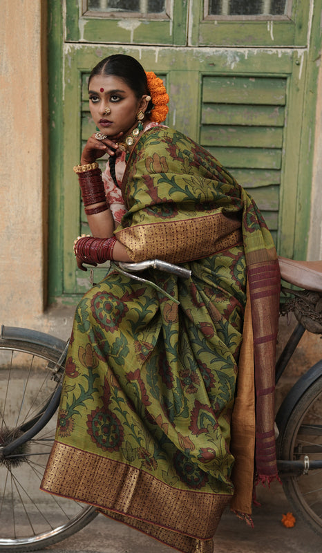 Hand painted pen kalamkari saree on a handwoven kanjiveram silk base. It comes with a running blouse piece.