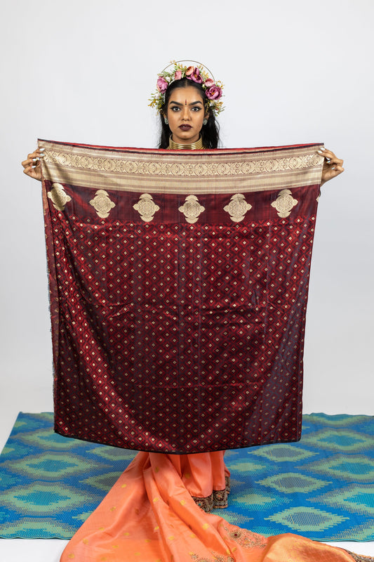 An unusual, handwoven, hand embroidered kanjiveram silk saree. The saree has been embroidered with hand using Ari Tari and Dabka work. There are big bootas that have been embroidered on the pallu to add to the magic of this piece. This saree is finished at the back with a border to give it a lovely finish when you move around. It comes with a benarsi brocade silk blouse piece as shown.