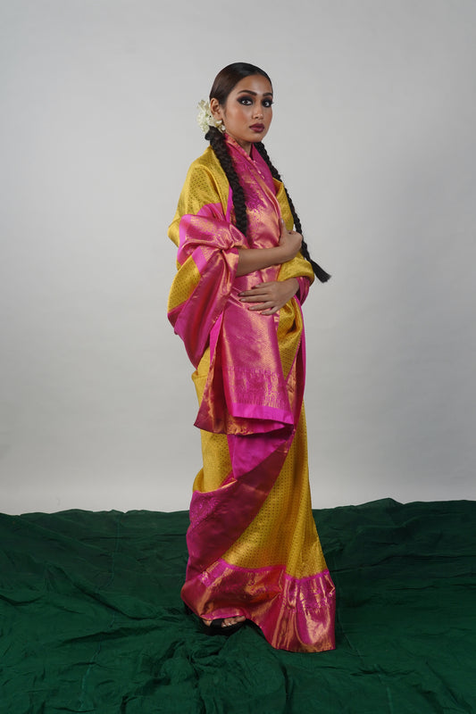 A beautiful handwoven mango yellow and pink Kanjivaram silk saree. It comes with a matching blouse as shown.