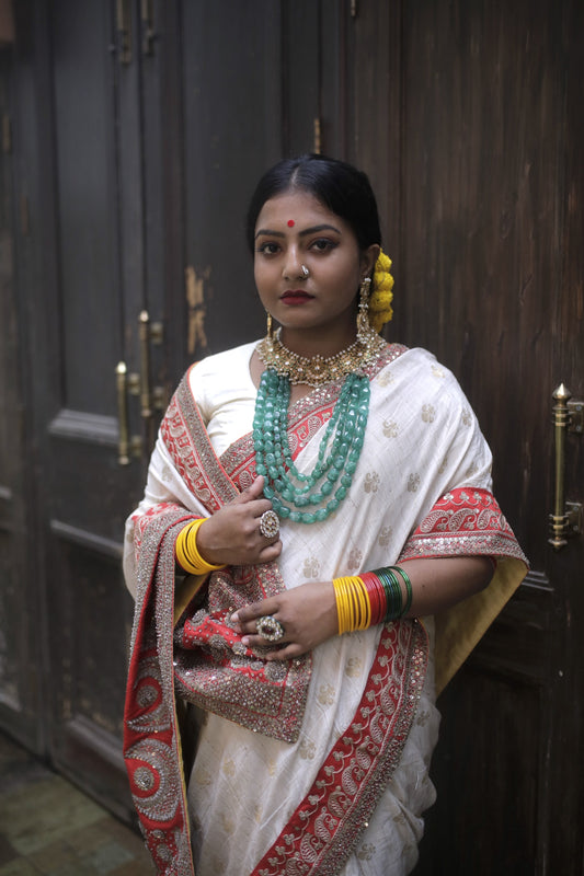 A beautiful white, gold and red banarsi tussar silk saree which has been hand embroidered with dabka and sequins work. It has a statement pallu and will come with an hand embroidered blouse piece with matching border.