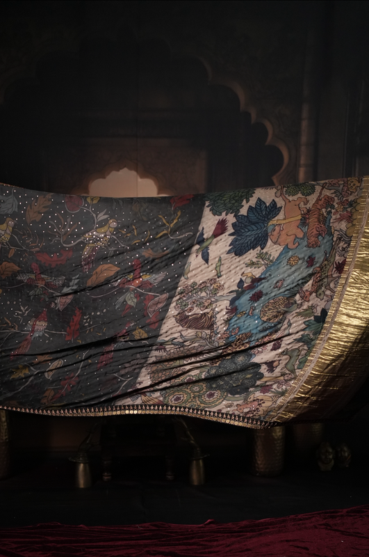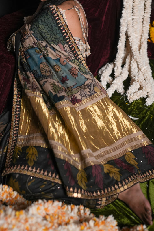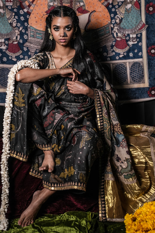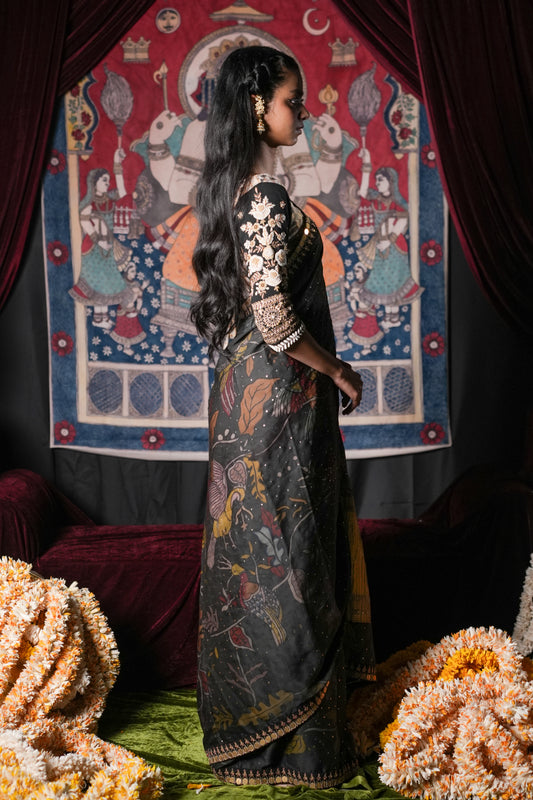 Please note slight imperfections in the artwork of the saree, colour smudges and bleeds are natural and a sign of its authenticity. This saree is completely handmade using vegetable dyes and the fine art of Kalamkari.