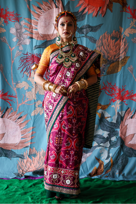 An unique, handwoven, single ikkat patola silk saree which has been hand embroidered with a beautiful border and pallu. It comes with an embroidered blouse piece as shown.