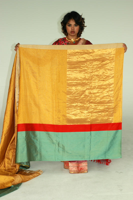Hand woven metallic gold full tissue pattu silk saree with a statement teal and red dandidar border. The saree comes with a matching blouse piece as shown.