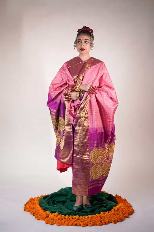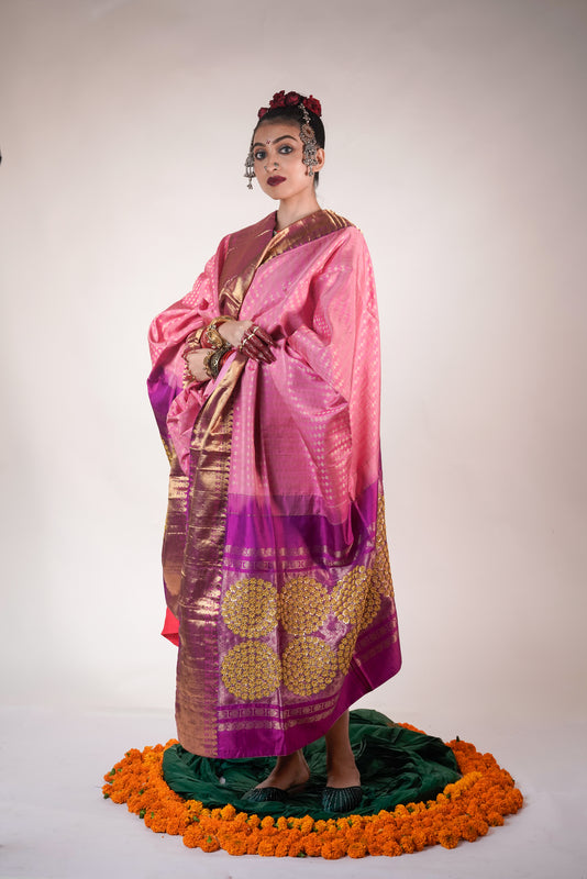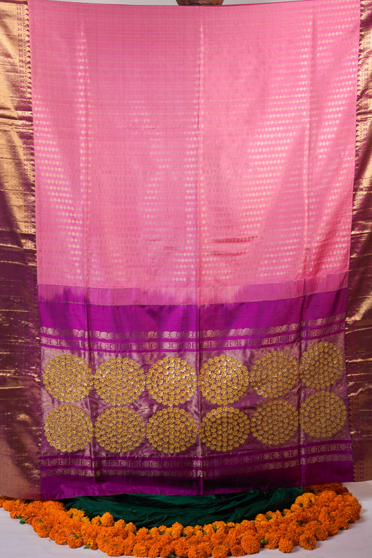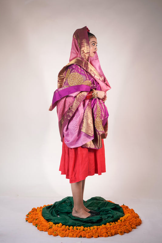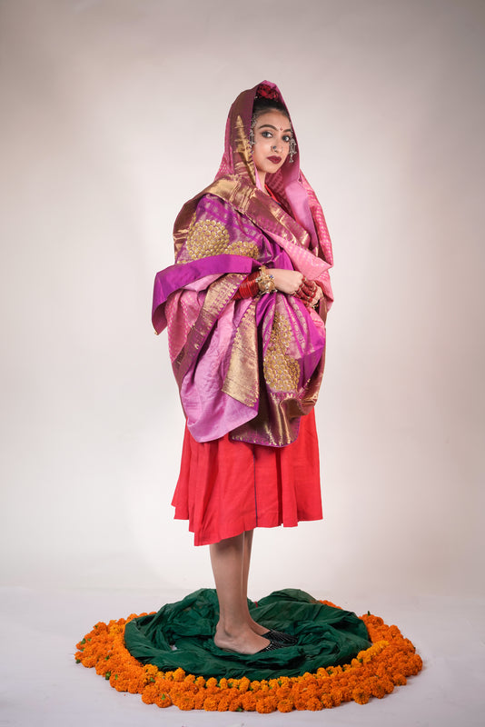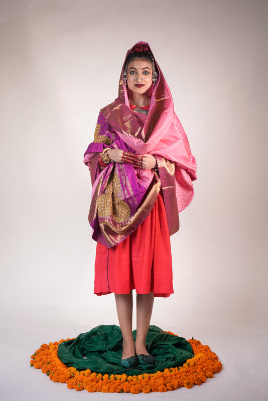 A handcrafted embroidered kanjiveram silk dupatta. The dupatta has got hand embroidered life size motifs on both ends. The dupatta is finished with a back border to give it a lovely finished when you move around.
