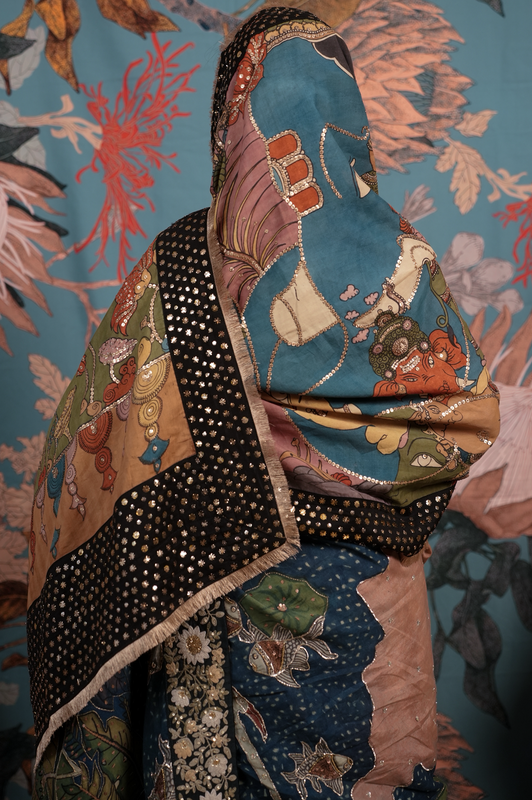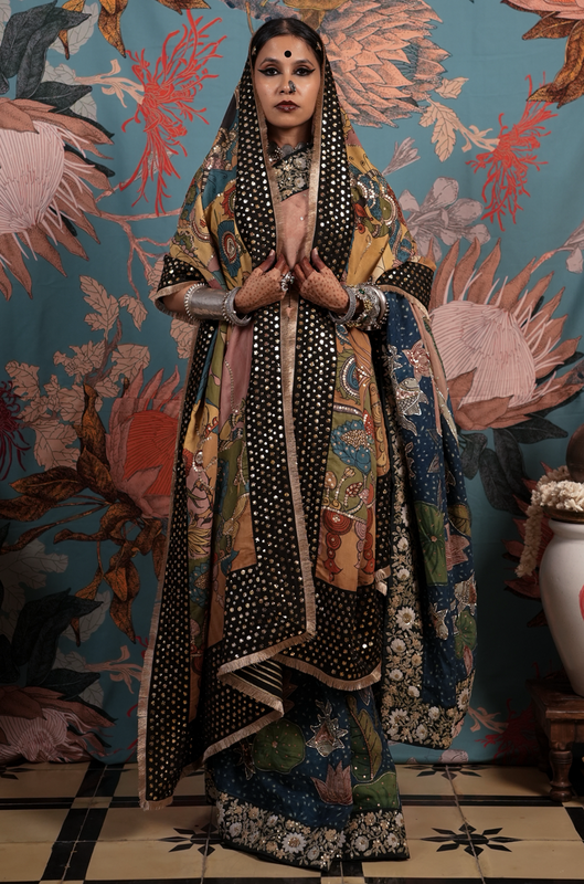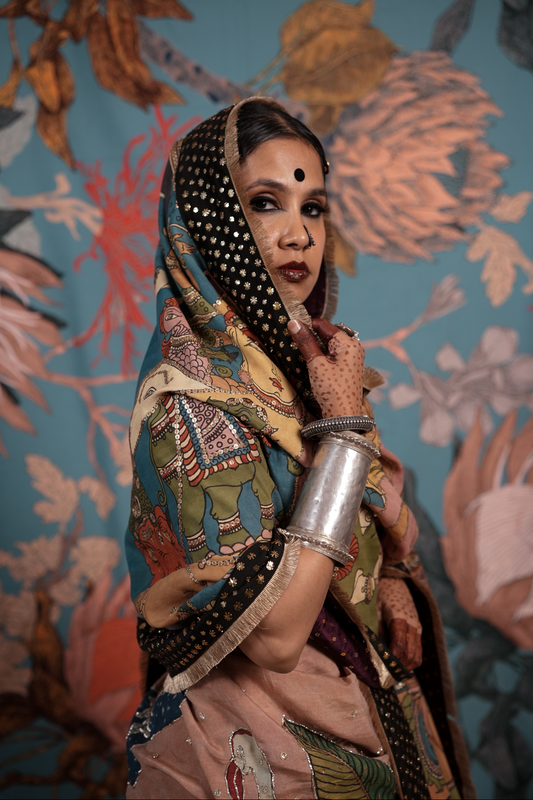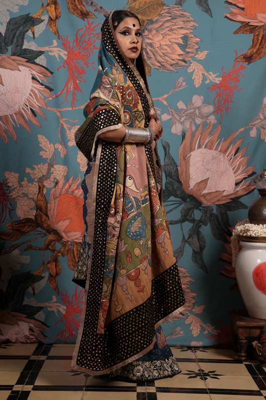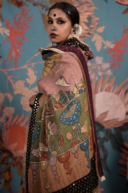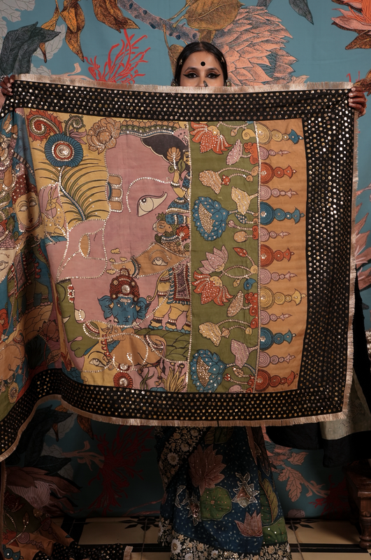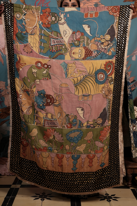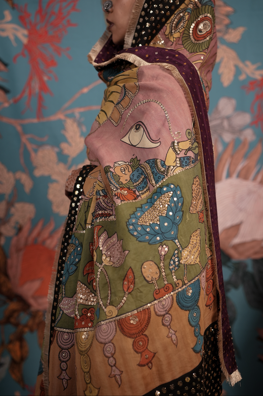 A handcrafted authentic embroidered kalamkari silk dupatta. The dupatta is finished with  an hand embroidered makes badla work border and a back Patti that gives it a lovely finish when you move.