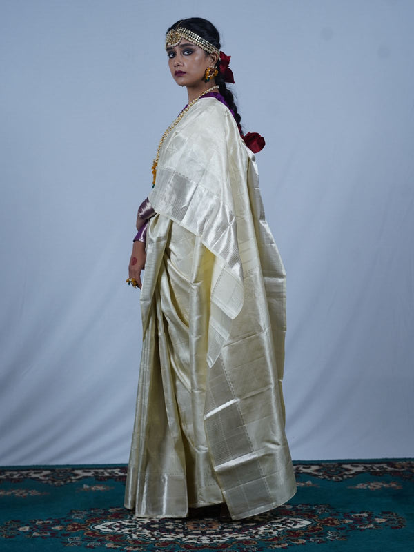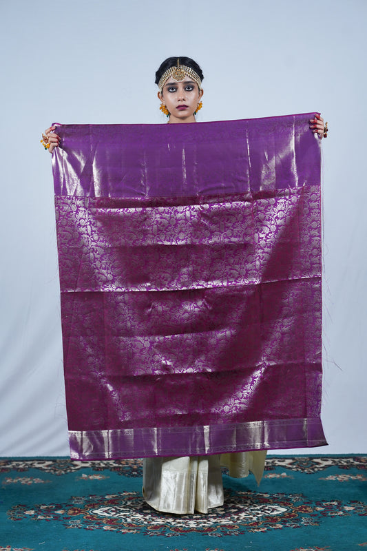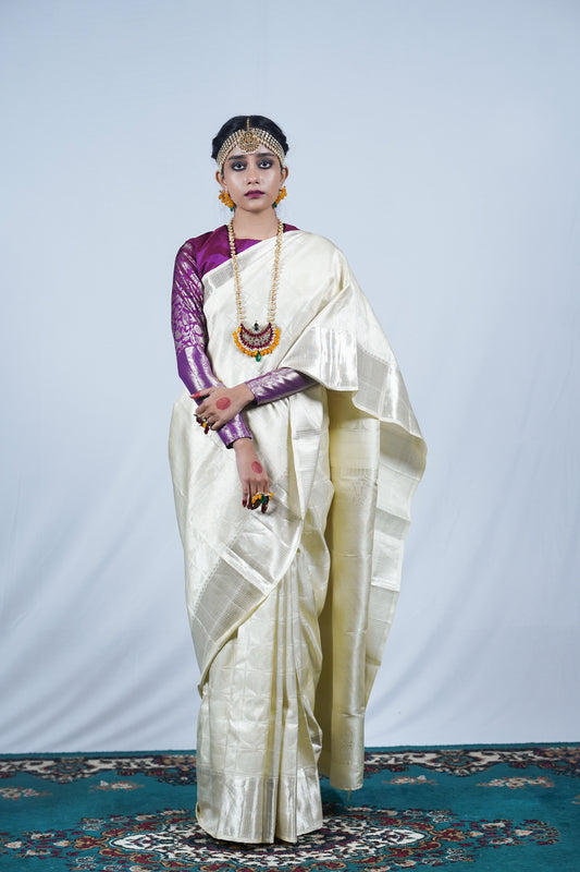 Hand woven Kanjiveram silk saree. It comes with 2 blouse pieces a matching blouse piece as shown and a purple kanjiveeram silk blouse piece (like the one worn by the model).