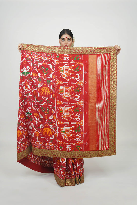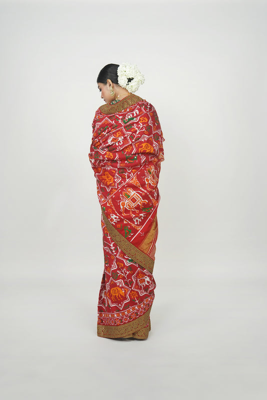 A double ikkat handwoven hand embroidered patan patola silk saree. It comes with a beautiful embroidered yellow blouse piece as shown. The saree has been finished with a silk border at the back to give it a lovely finish when you move around.