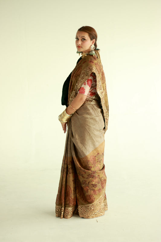 A beautiful handwoven banarasi gold and silver full tissue silk saree which has hand painted pen Kalamkari painting all over. The saree has been hand embroidered with Ari Tari work and it comes with a contrasting green brocade silk blouse shown separately.
