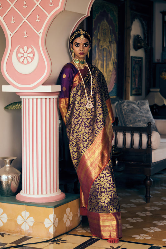 Hand woven Kanjeevaram silk saree. It comes with 2 blouse pieces - a pink matching blouse piece attached with the saree and a contrasting ivory and purple kanjiveeram silk blouse piece (like the one worn by the model).