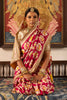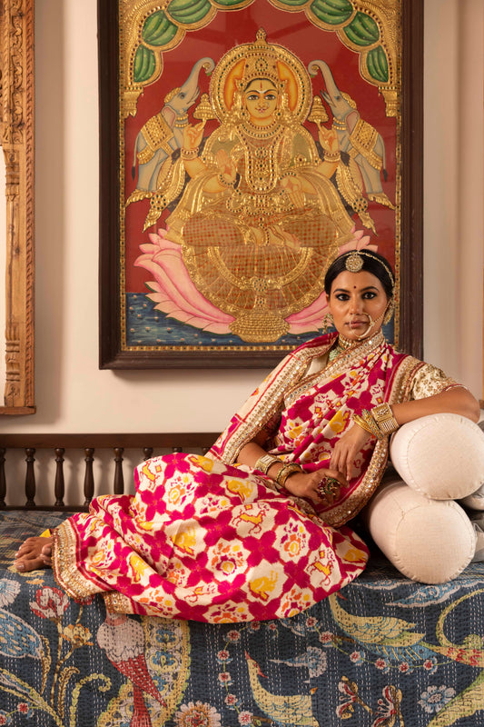 A double ikkat handwoven hand embroidered patan patola silk saree. It comes with a beautiful embroidered white/ivory blouse piece as shown. The saree has been finished with a silk border at the back to give it a lovely finish when you move around.