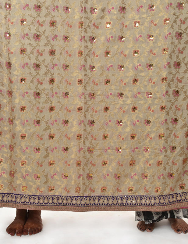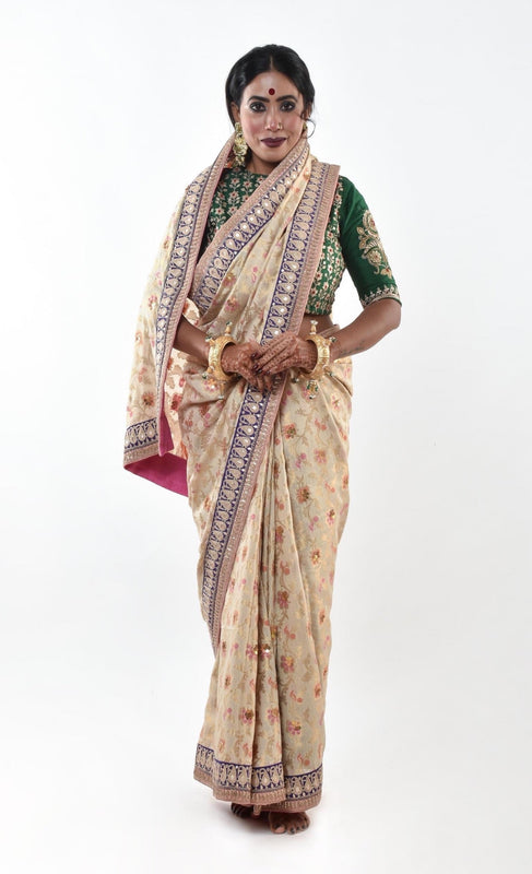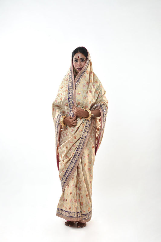 A beautiful handwoven hand embroidered banarasi silk saree. The whole saree has been embellished with sitara work and finished with a gorgeous madori work border. The saree is finished with a back Patti to give it beautiful finish when you move around. It comes with a matching blouse piece as shown.